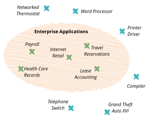In the early part of this century, I worked on my book Patterns of Enterprise Application Architecture. One of the problems I had when writing the book was how to title it, or rather what to call the kinds of software systems that I was writing about. I've always been conscious that my experience of software development has always been focused on one particular form of software - things like health care records, foreign exchange trading, payroll, and lease accounting. These are very different to embedded software inside printers, games, flight control software, or telephone switches. I needed a name to describe these kinds of systems and settled on the term “enterprise application”.