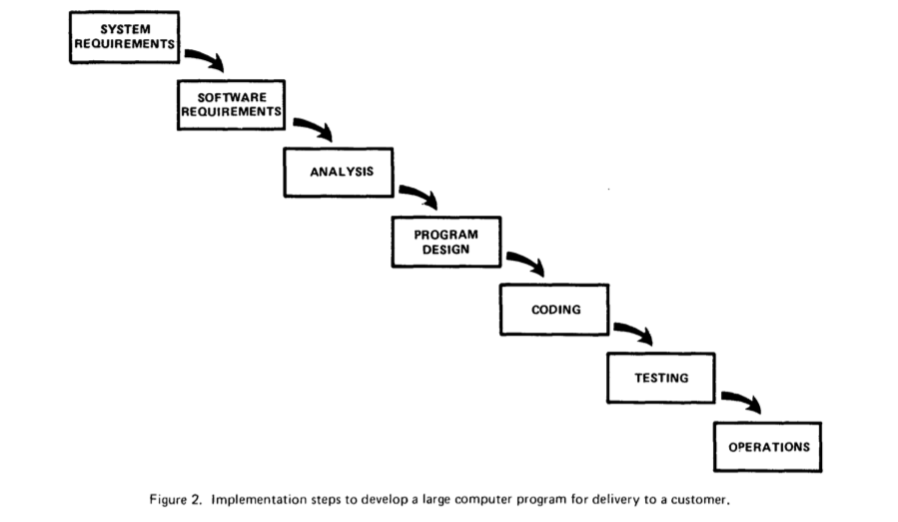 Although this paper seems to be universally acknowledged as the source of the notion of waterfall (based on the shape of the downward cascade of tasks), the term “waterfall” never appears in the paper. It's not clear how the name appeared later.